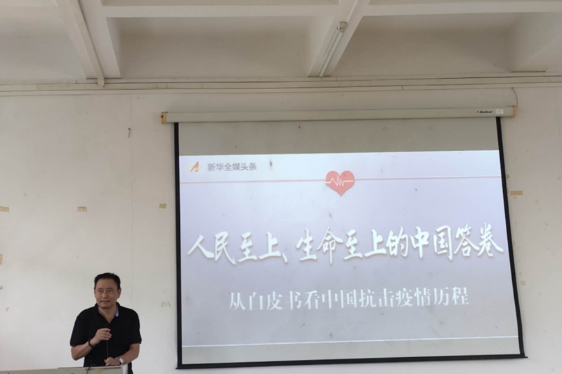 社会体育系张军主任用包含深情的讲话,向在座全体师生介绍了本次活动的背景和意义。陈青彪书记结合精心准备的PPT,将疫情之下“我们在行动”的事例娓娓道来。