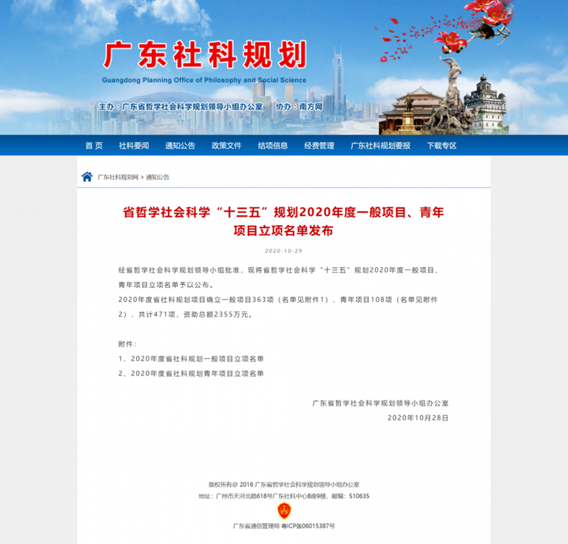 广东省哲学社会科学“十三五”规划课题研究项目是省政府落实教育部实施“高校哲学社会科学繁荣计划”的一项重要内容,以支持高等学校、科研院所为适应国家及地方经济社会发展的需要,促进新时代中国特色哲学社会科学繁荣发展,把握学科前沿,开展深入、系统的创新性研究为宗旨,着力推出体现我省特色、代表我省水平的哲学社会科学研究成果,传承中华文明、服务国家及地方需求、铸造学术精品为目标,2020年度省社科规划项目确立一般项目363项、青年项目108项,共计471项,资助总额2355万元。