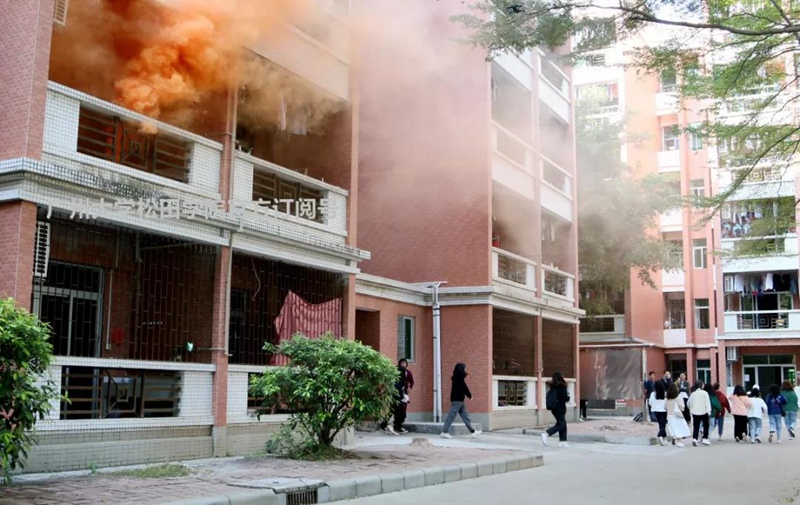 警铃突然响起,消防疏散演练正式开始。在1、2、3、4、6栋宿舍楼的学生们捂着口鼻,弯着腰、低着身子快步下楼,紧张有序地从宿舍按指定的路线往安全的区域撤离。