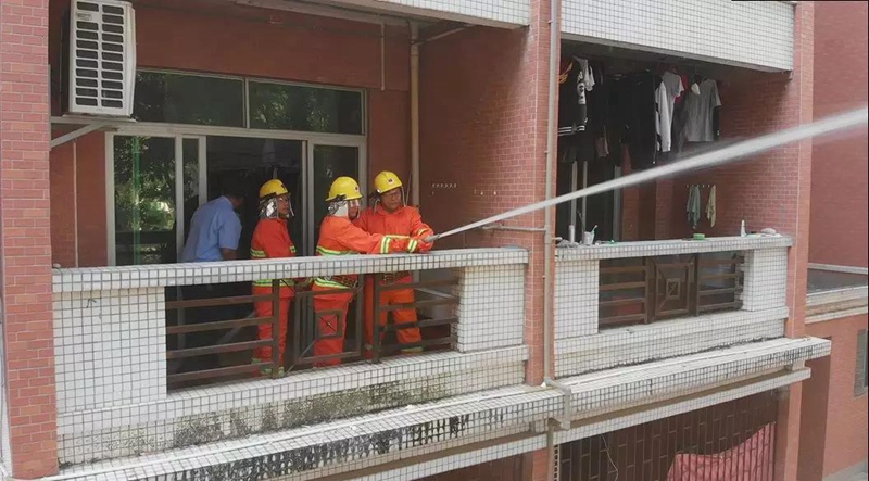 宿舍区冒起了浓烟,宿舍消防人员立即赶往现场并使用水枪对隐患区域进行扑灭,浓烟在一分钟内得到了有效的控制,达到了应急预案效果。