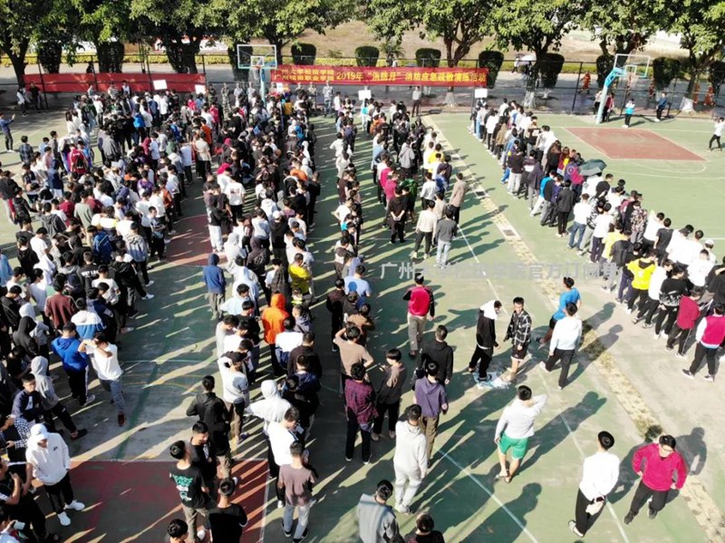 参与演练的学生已基本从宿舍撤离完毕,学生们一路小跑至指定的区域(篮球场)进行集合。