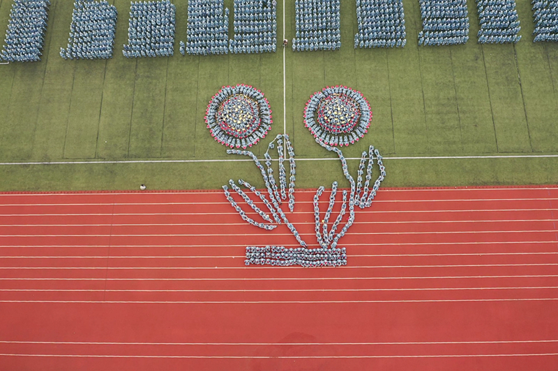 随后,全场师生齐唱《我和我的祖国》,振奋的歌声在足球场上空响彻,现场气氛高涨。