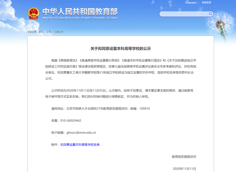 11月11日,教育部官网发布《关于拟同意设置本科高等学校的公示》,根据《高等教育法》《普通高等学校设置暂行条例》《普通本科学校设置暂行规定》和《关于加快推进独立学院转设工作的实施方案》等法律法规政策规定,经第七届全国高等学校设置评议委员会专家考察和评议,并经党组会审议,拟同意21所独立学院转设为独立设置的本科学校,其中,广州大学松田学院拟转设为广州应用科技学院。公示时间为2020年11月11日至11月25日。