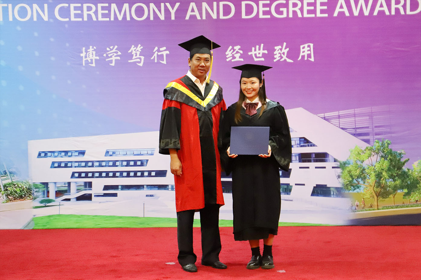 (▲中教集团谢可滔主席亲自颁发了我校转设后的第一张毕业证书:2021届市场营销专业2班曹静同学)