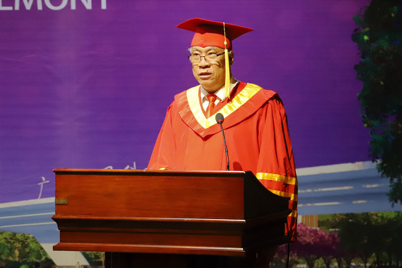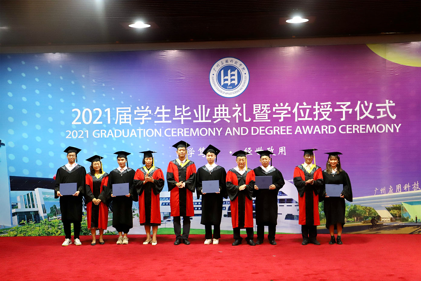 中国教育集团控股有限公司联席主席谢可滔、广州应用科技学院董事长刘剑锋、校长庞永师、党委书记王永云等校领导为毕业生代表颁发毕业证书和拨穗。副校长刘根正、党委副书记裴九雄、副校长李文鹏、副校长刘志新、副校长李荆松等校领导为优秀毕业生代表、考上研究生的毕业生,以及参加西部计划的毕业生颁发纪念品。毕业典礼由副校长李江凌主持。