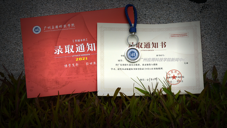 翻开内页,庄重的设计工艺下,我校董事长、校长刘剑锋亲笔签发的2021级新生录取通知书,加盖学校红色印章,通过纸张与文字,跨越山海与时间,传递到每位广州应用科技学院新生手中。