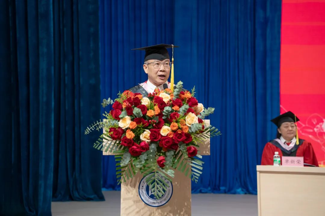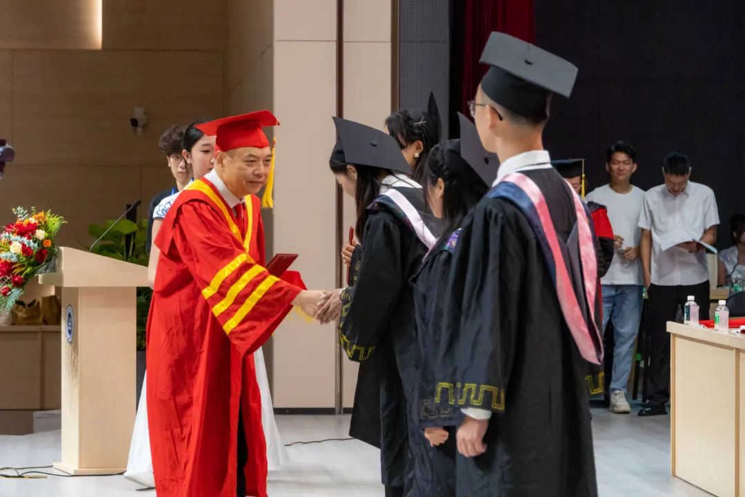 庄严而隆重的毕业典礼上,校长刘剑锋带领校领导班子和学位评定委员会委员,共同为毕业生代表颁发毕业证、学位证,并拨穗正冠、合影留念。拨穗礼成,象征着毕业生们从求学者到知识传承者的转变,标志着新的人生征途即将启航,青春永熠,奔赴祖国山海。