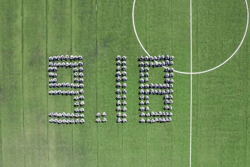 从无人机航拍可看到,“9.18”、“1949—2020”和一把钢枪的图案显现在学校运动场。